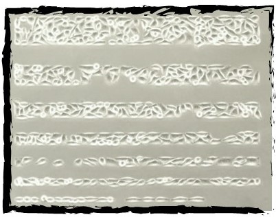 寬度為100至10 um的行中的HeLa細胞