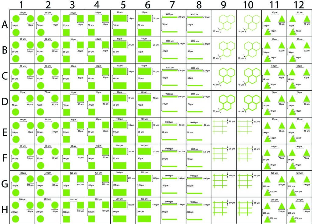 > Each 96-well plate has the 6 standard shapes of : dots, squares, rectangles, triangles, lines, and grids, as well as sizes going from 10 to 150 ?m.