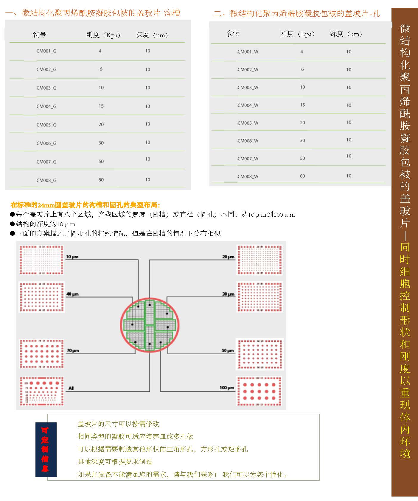 基底微圖案納米表面,該圖案具有亞微米對齊的凹槽,并且其硬度可調節(0.1-80kpa)。 微圖案有助于形成排列的細胞單層,使它們具有結構排列和組織性,從而使細胞更加成熟和生理地表達。